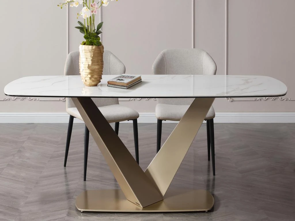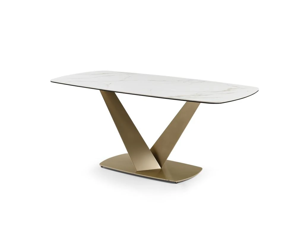 La table à manger PORELIMA offre un bel alliage de matières avec de la céramique, du verre trempé et du métal qui font d’elle une table très résistante. Le plateau en effet marbre blanc est souligné par le piètement doré pour créer un aspect brut et glamour.