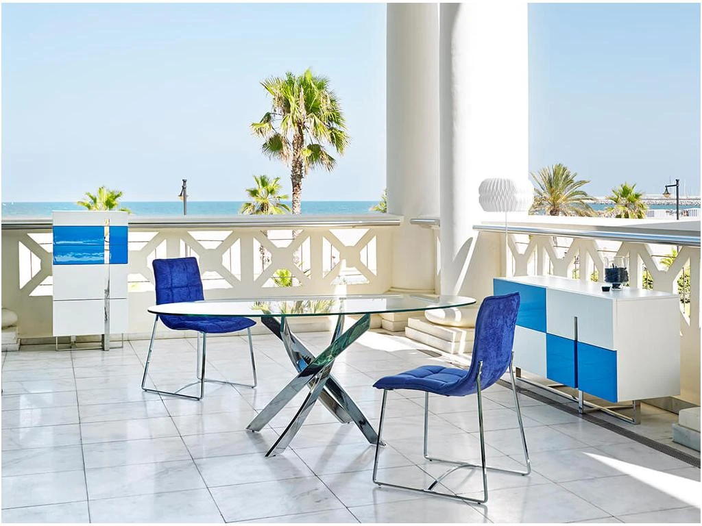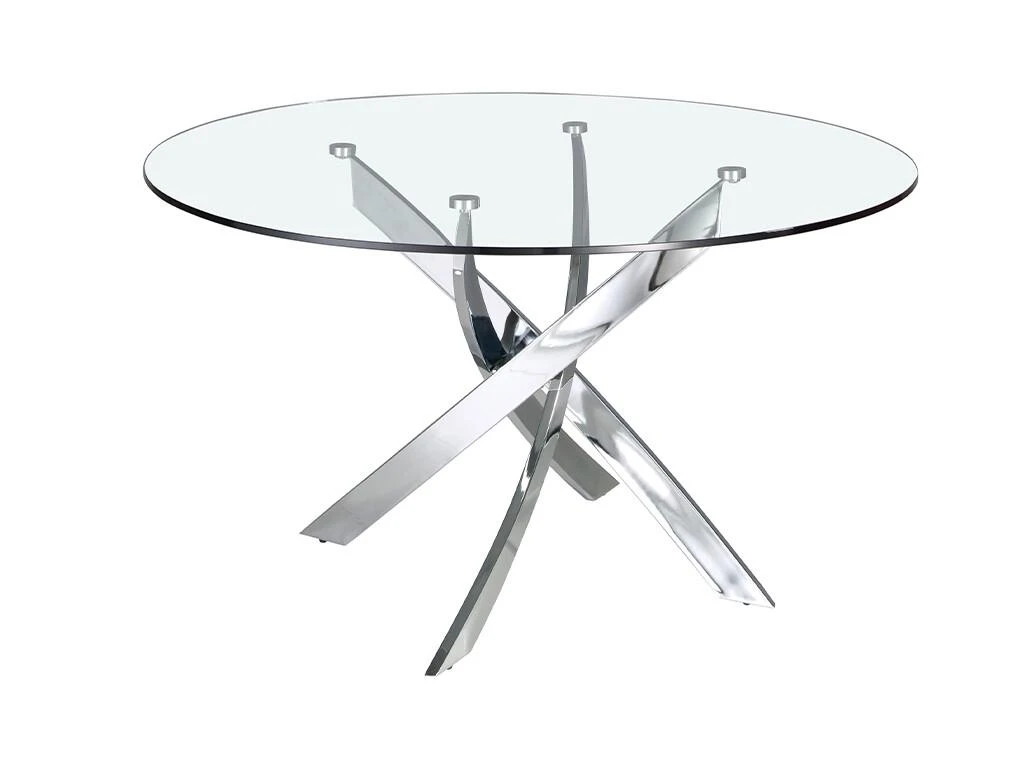 Table de salle à manger ronde au design moderne avec plateau fixe en verre trempé de 12mm et bords polis. Sa base originale en acier inoxydable chromé de 22 microns est l’un des éléments clés de son design. Une table parfaite pour apporter de la luminosité et de l’avant-garde à votre cuisine, votre salon ou votre salle à manger.