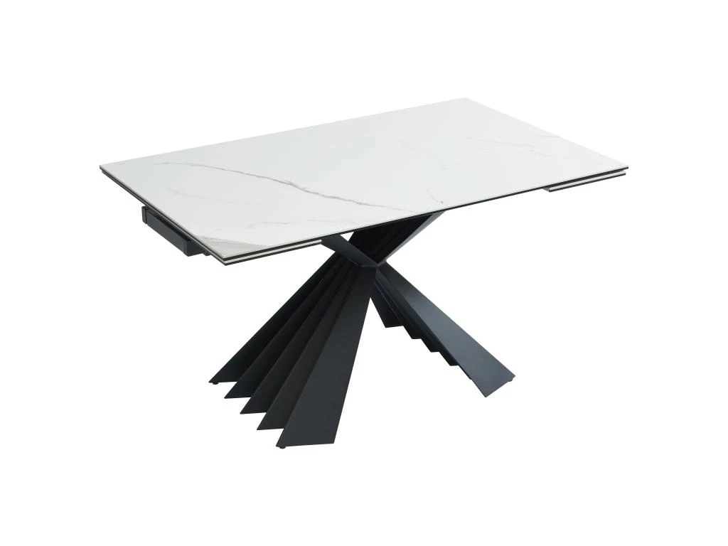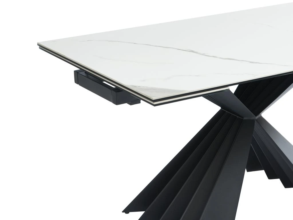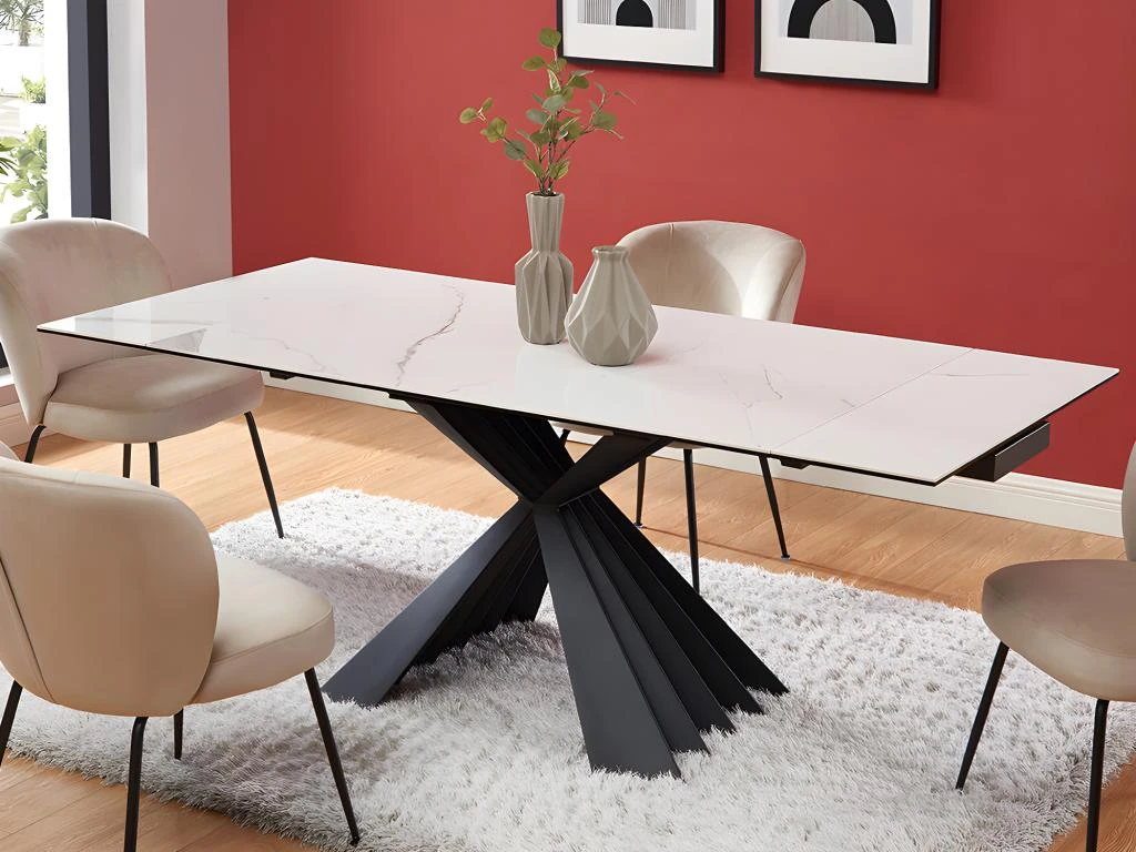 La table à manger BEKIM est composée d’un plateau en verre trempé et céramique et d’un piètement en métal. Elle dispose d’un système à 2 allonges très utile pour organiser de grands repas. Son style design est visible par son mélange de matières innovant et la forme singulière de son piètement.