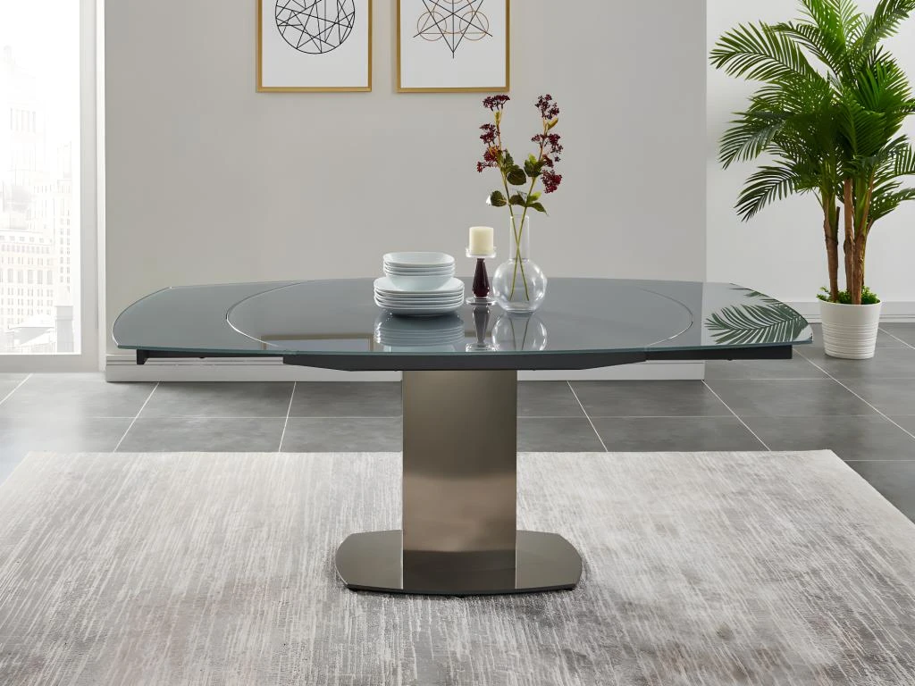 Le plateau en verre trempé peint d’épaisseur 10mm confère à la table TALICIA éclat et élégance. Cette table séduit par sa structure épurée et robuste en acier inoxydable. Son plateau extensible, en verre trempé d’une longueur de 130cm, pivote sur 360° pour atteindre une longueur de table de 190 cm. Vous passerez, sans efforts, d’une table de 6 couverts à une table de 8 couverts pour des repas très conviviaux. Son allure, tout en finesse, ravira les amoureux de mobilier moderne et contemporain.
