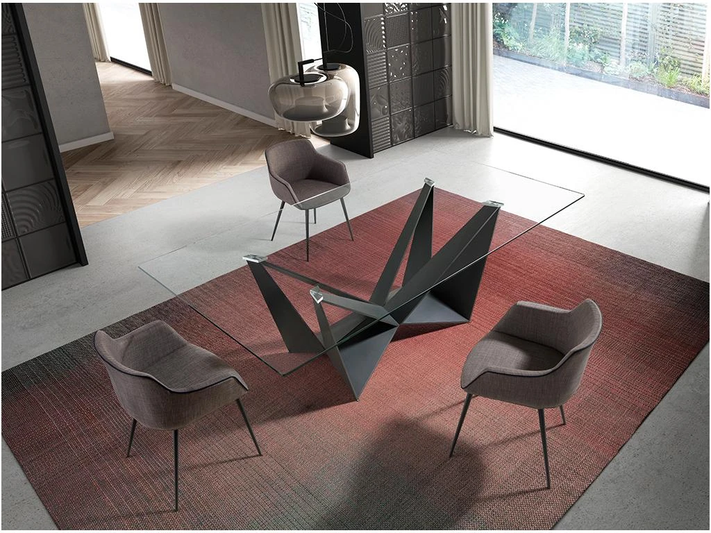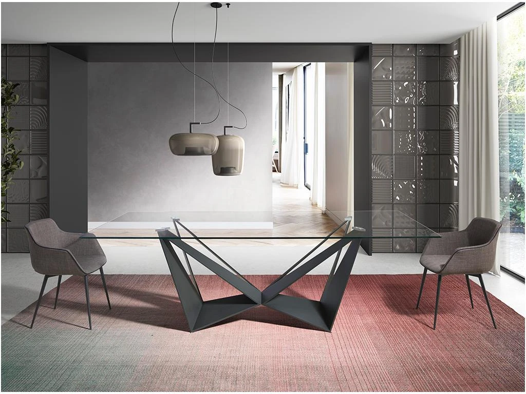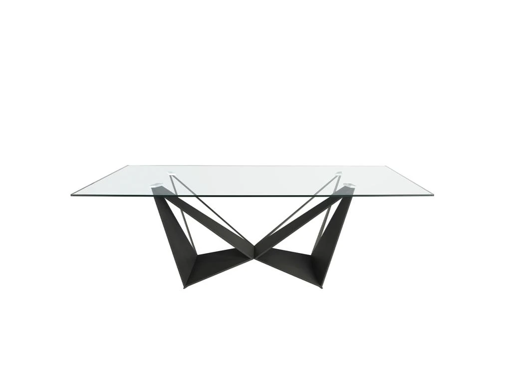 Table de salle à manger rectangulaire au design moderne avec un plateau fixe en verre trempé de 12 mm et des bords polis. Sa base originale en acier inoxydable laqué noir mat est l’un des éléments clés de son design. Une table parfaite pour apporter de la luminosité et de l’avant-garde à votre cuisine, votre salon ou votre salle à manger