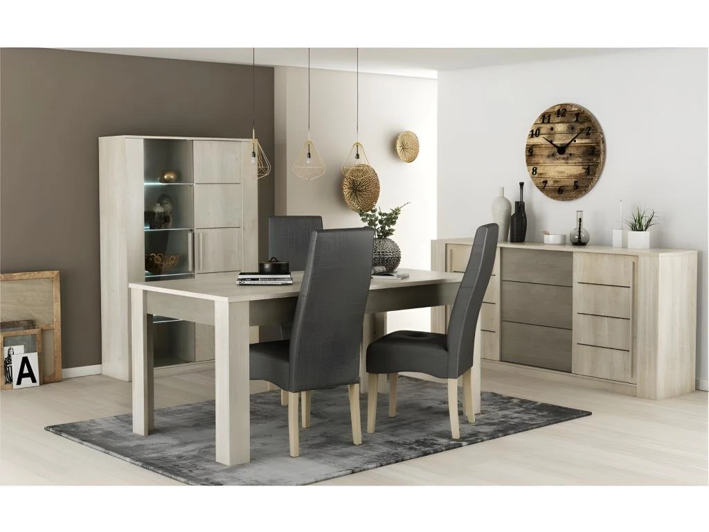 Table très moderne avec ses 2 coloris : chêne champagne et béton foncé. Table assortie aux autres meubles de la collection du même nom. Table extensible de 170 à 230 cm de long pouvant accueillir jusqu’à 8 voire 10 convives avec sa rallonge centrale. En panneaux de fibres de bois de 16 et 22 mm d’épaisseur. A monter soi-même. Dimensions de la table avec allonge : Largeur: 90 cm, Longueur: 230 cm, Hauteur: 77 cm. Poids 55 kg.