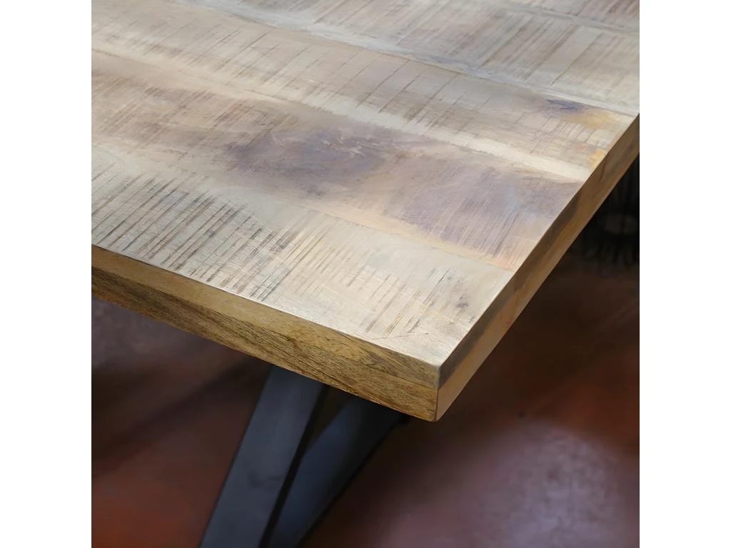 Pour un style indus très tendance, optez pour cette table de salle à manger en bois de manguier massif et pieds métal. Ses dimensions de 200×100 cm conviendront jusqu’à 8 convives. Le plateau en bois massif de 5cm dispose d’irrégularités dans le bois, pour un effet encore plus brut. A monter soi même. Dimensions : L. 200 x L. 100 x H. 77 cm. Poids : 58,6 kg. Matière : bois de manguier massif et métal.
