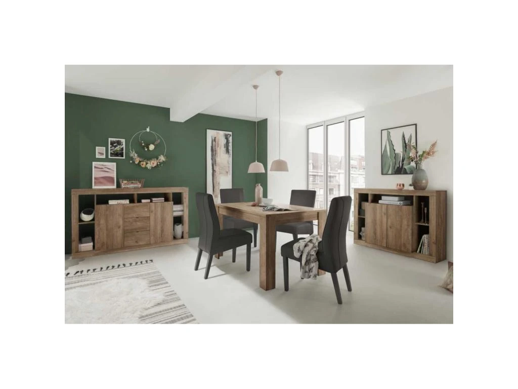 Prévue pour recevoir très confortablement 8 personnes après la mise en place des 2 allonges cette table de salle à manger bénéficie d’une grande robustesse, d’une facilité d’entretien appréciable et d’une stabilité rassurante.