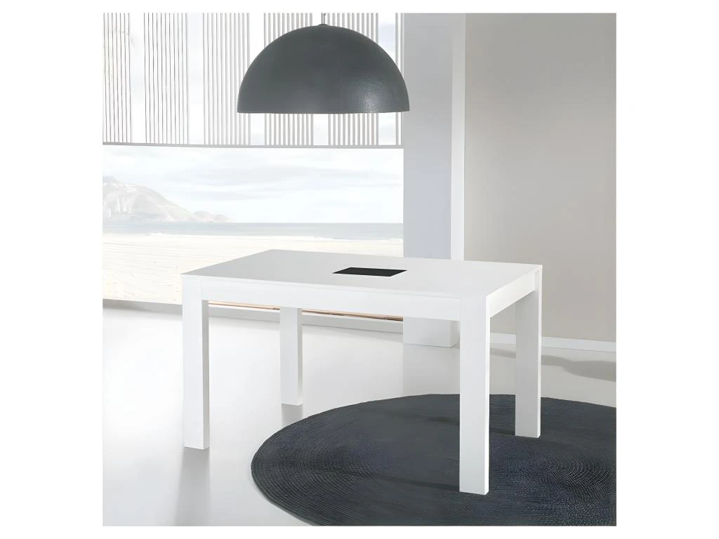 Table de repas extensible, finition laque blanche et verre noir.
