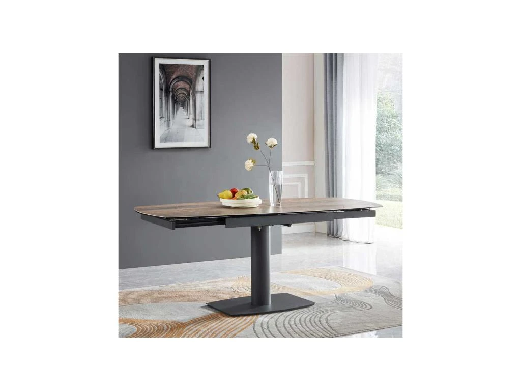 Gage d’un potentiel décoratif exceptionnel et d’une stabilité rassurante cette table de repas à allonges bout de table intégrées repose sur un piétement central en métal.