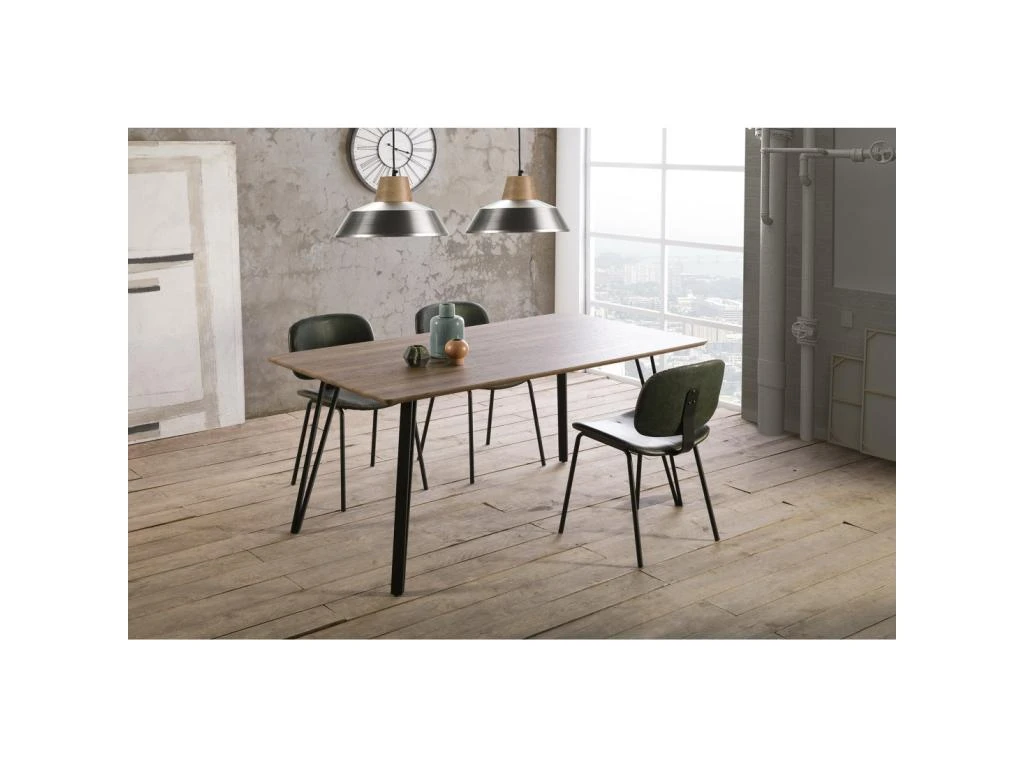Faites entrer le style Industriel dans votre salle à manger ou votre cuisine avec cette table de repas proposant le mariage d’un piétement épingle en métal laqué noir et d’un plateau au revêtement décor Chêne moyen.