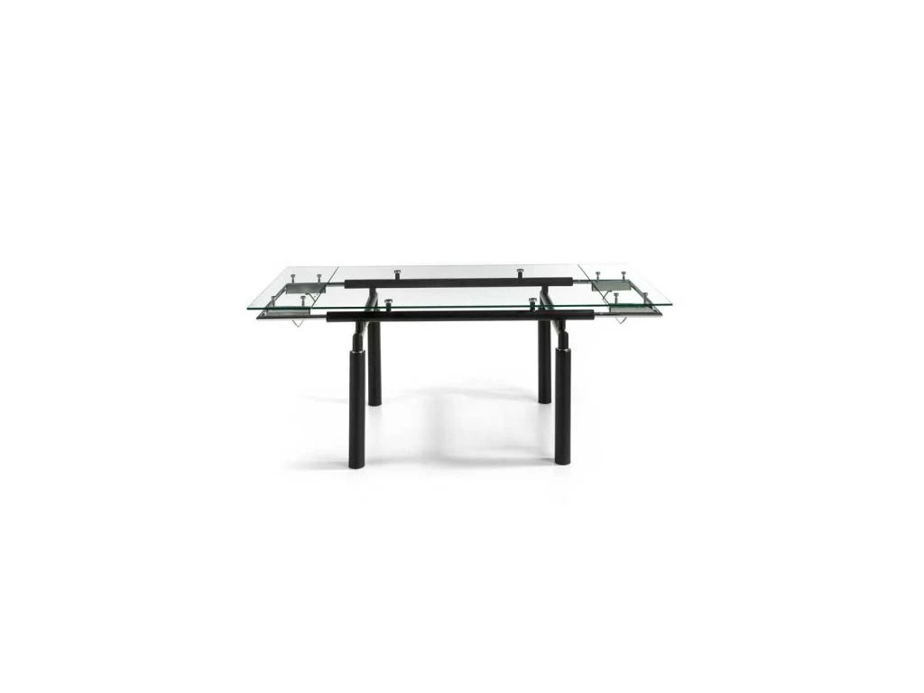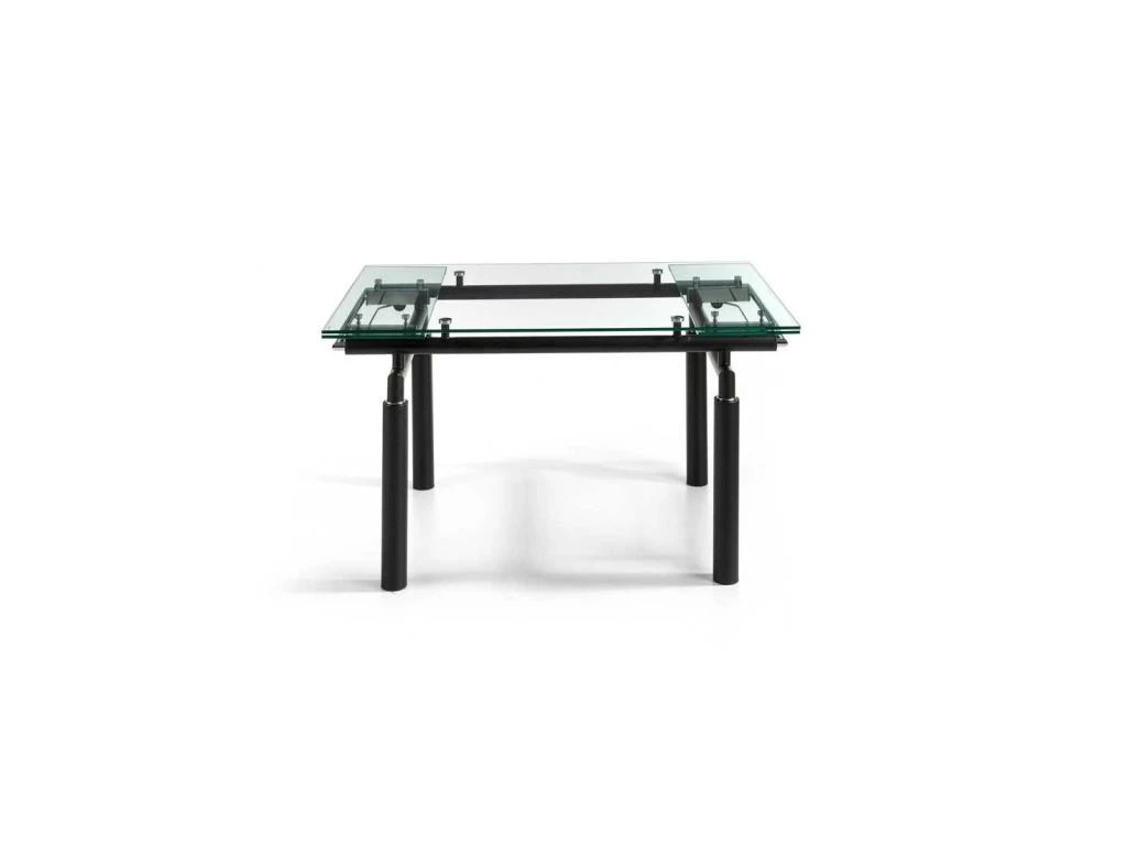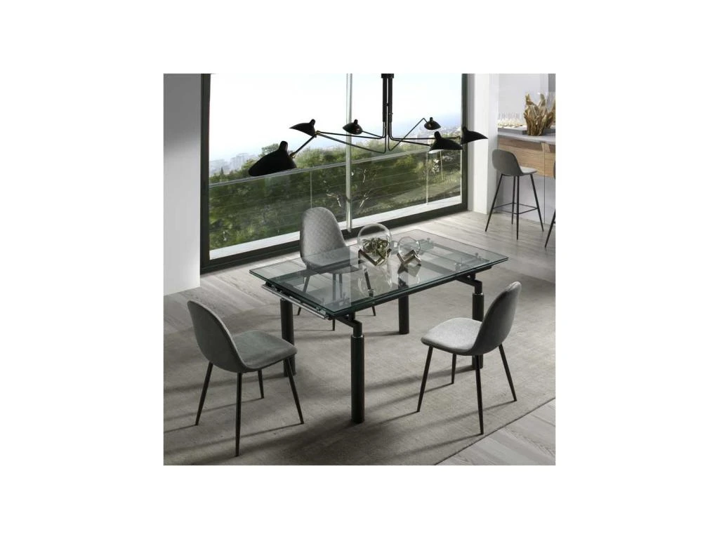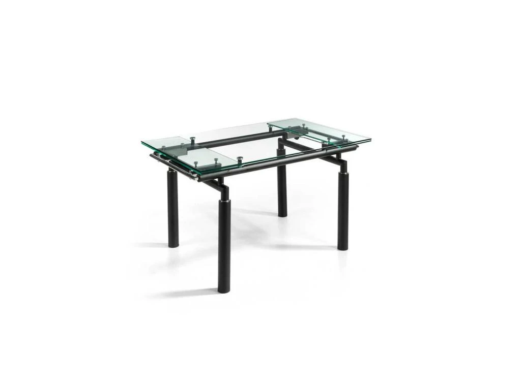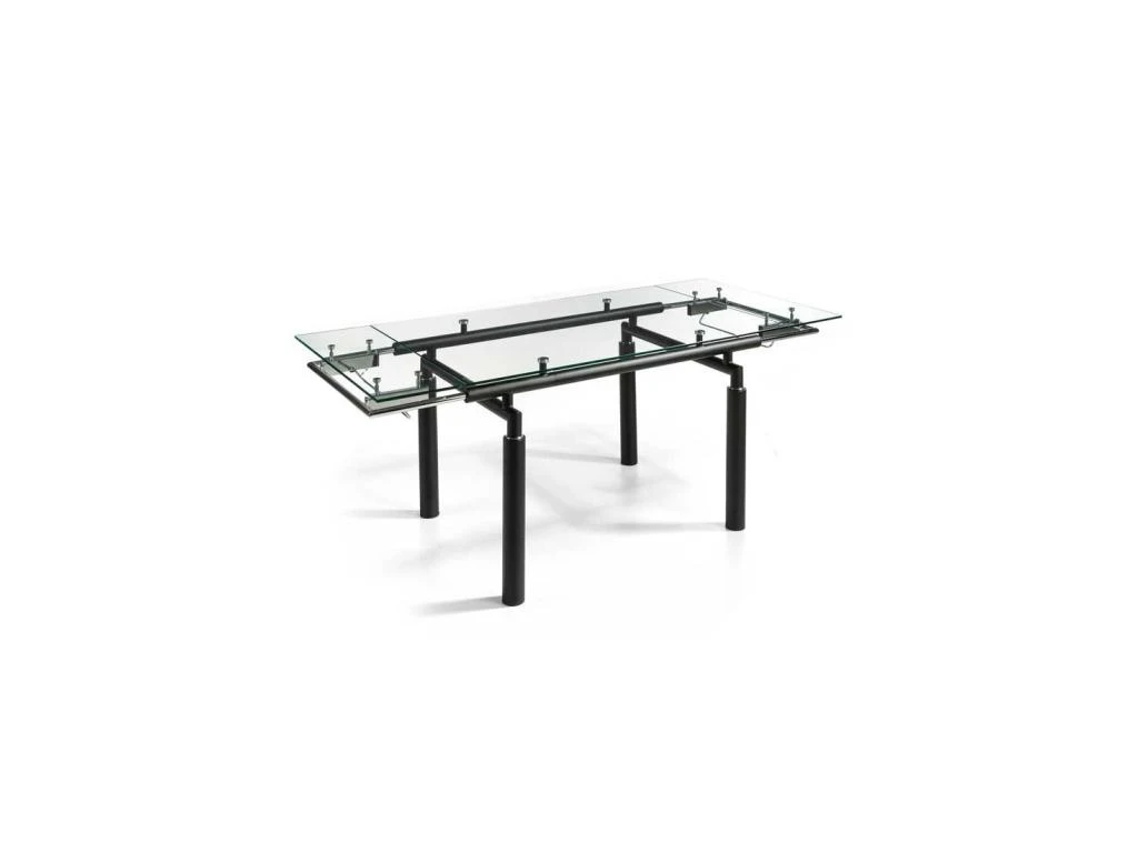Reposant sur une structure en métal laqué noir mat, le plateau principal en verre trempé de 10 millimètres d’épaisseur laisse admirer le piétement et la tubulure qui renferme le système d’allonges.