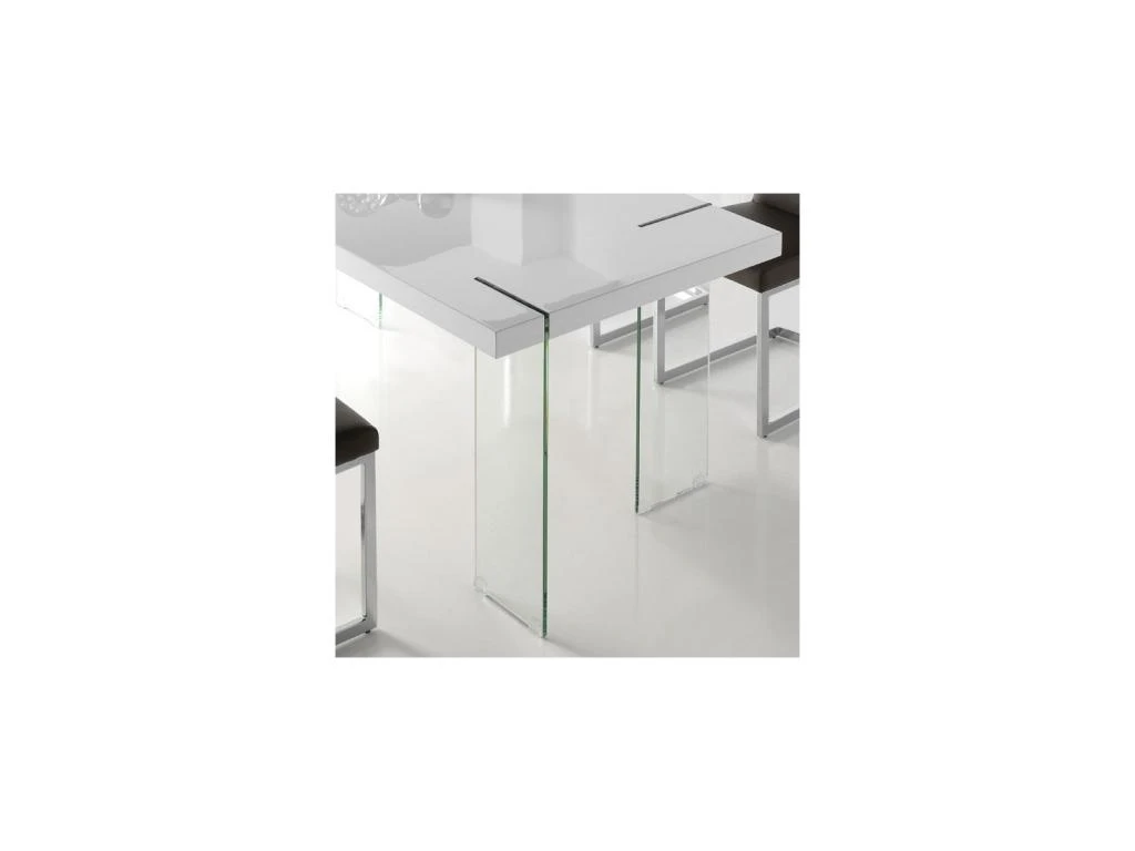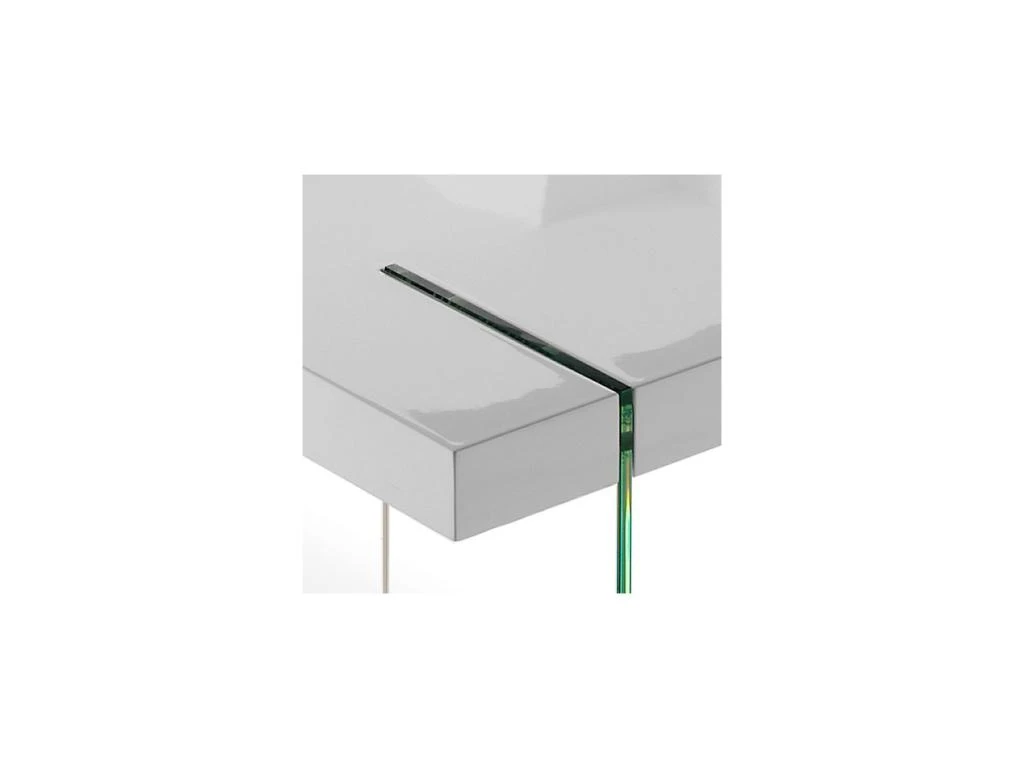 Le plateau en MDF laqué blanc brillant posé sur des pieds en verre trempé de 12 millimètres d’épaisseur semble être en lévitation.