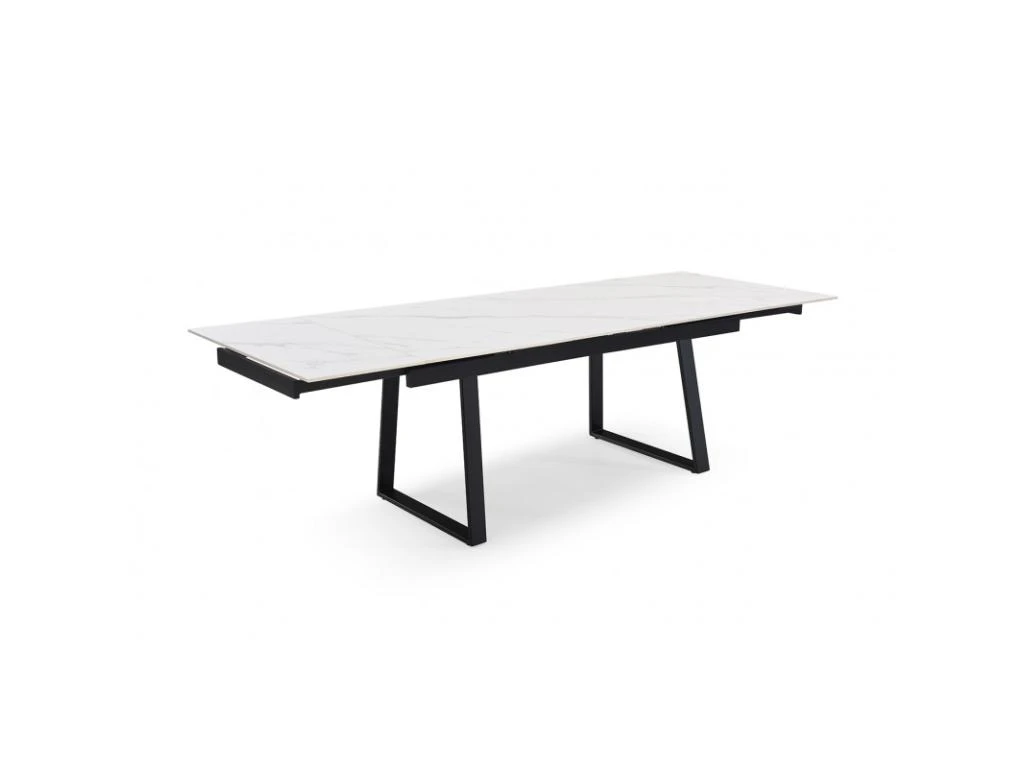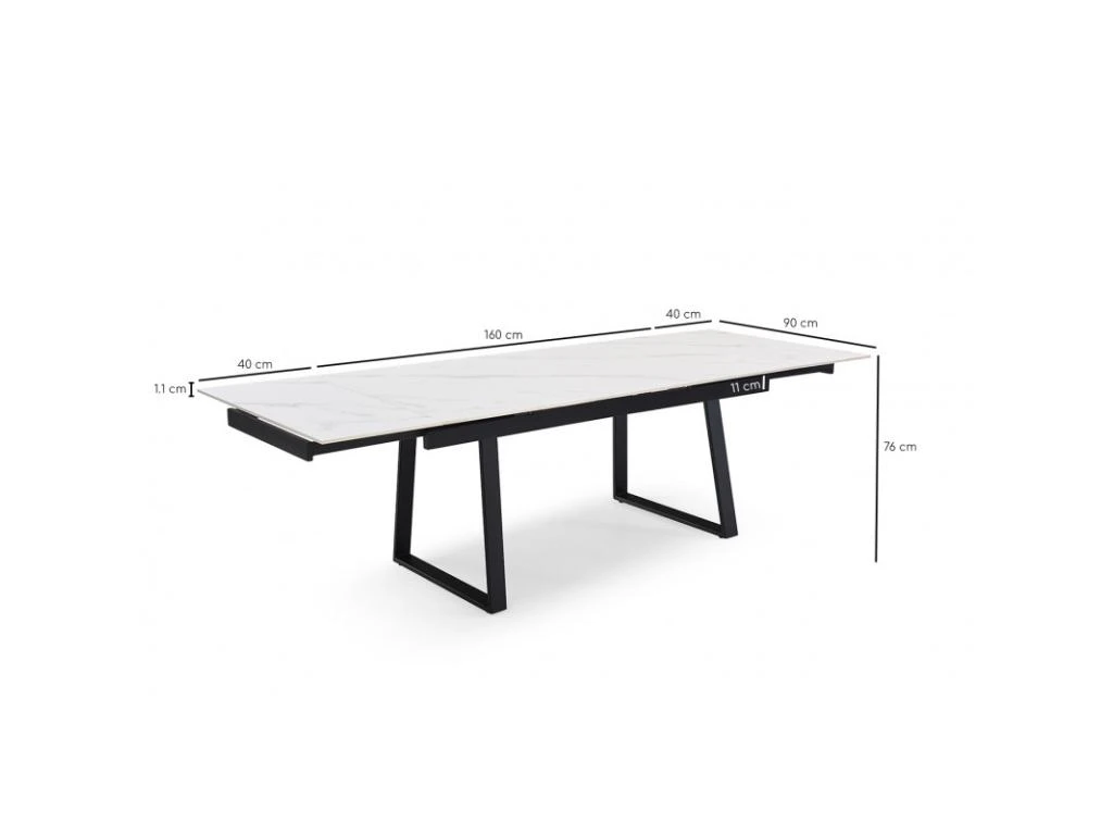 La table personnalisée adaptée à vos envies ! Son plateau en céramique pleine masse de 11mm blanc marbré mat est robuste et lumineux. Attablez jusqu’à 10 personnes grâce à ses 2 rallonges intégrées de 40 cm chacune, pratiques, et simple d’utilisation. Elle passe ainsi de 160 à 240 cm. Son plateau en céramique lui confère des qualités remarquables : résistance aux rayures, insensible aux taches diverses, et ne craint pas les différences de températures. Son piètement luge en méta noir vous assure une stabilité et une robustesse sans faille !