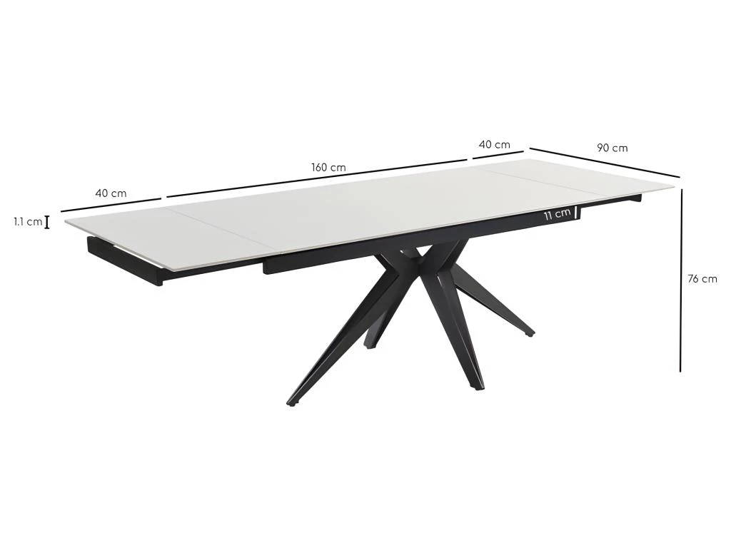 La table personnalisée adaptée à vos envies ! Son plateau en céramique pleine masse de 11mm blanc mat est lumineux et robuste. Attablez jusqu’à 10 personnes grâce à ses 2 rallonges intégrées de 40 cm chacune, pratiques, et simple d’utilisation. Elle passe ainsi de 160 à 240 cm. Son plateau en céramique lui confère des qualités remarquables : résistance aux rayures, insensible aux taches diverses, et ne craint pas les différences de températures. Son piètement étoile ajouré en métal noir vous assure stabilité, robustesse et finesse !