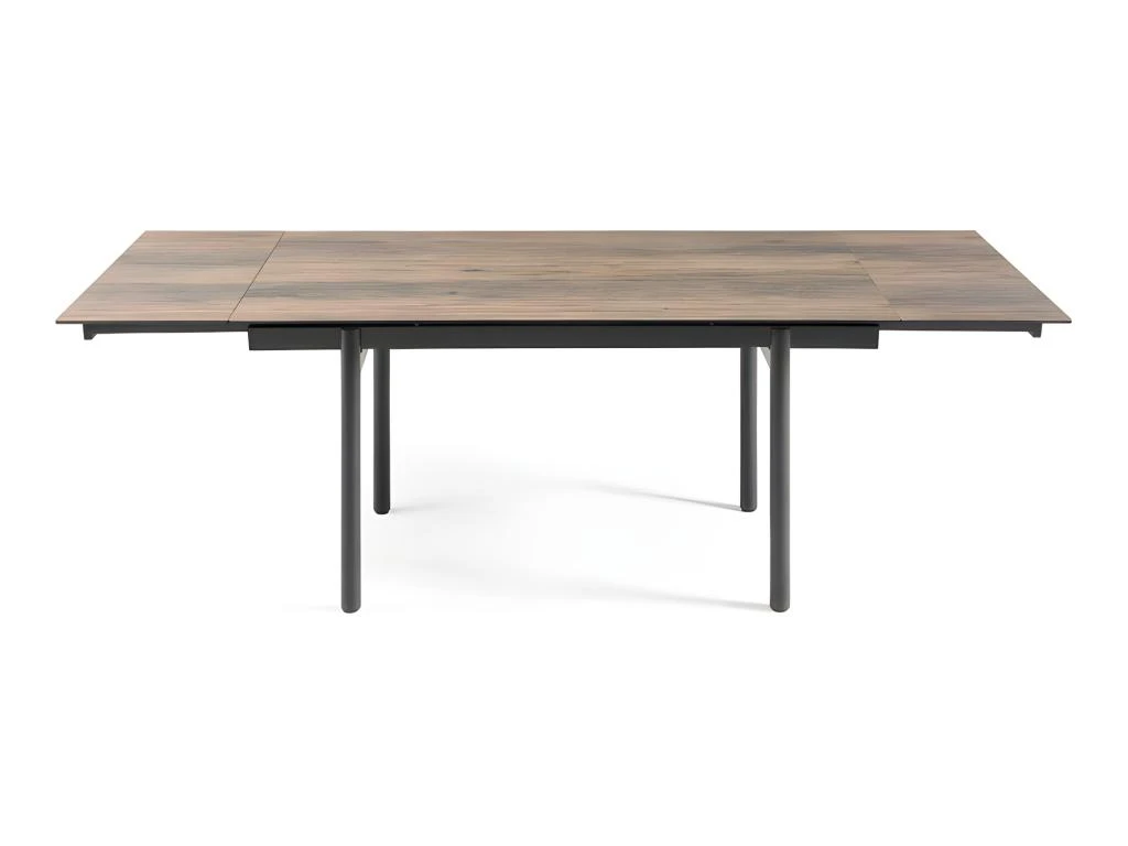 La table personnalisée adaptée à vos envies ! Son plateau en céramique Italienne de 3mm au décor bois vieilli marron finition mate est original. Attablez jusqu’à 10 personnes grâce à ses 2 rallonges intégrées de 40 cm chacune, pratiques, et simple d’utilisation. Elle passe ainsi de 160 à 240 cm. Son plateau en céramique lui confère des qualités remarquables : résistance aux rayures, insensible aux taches diverses, et ne craint pas les différences de températures. Ses 4 pieds droits en métal noir vous assurent stabilité et finesse !