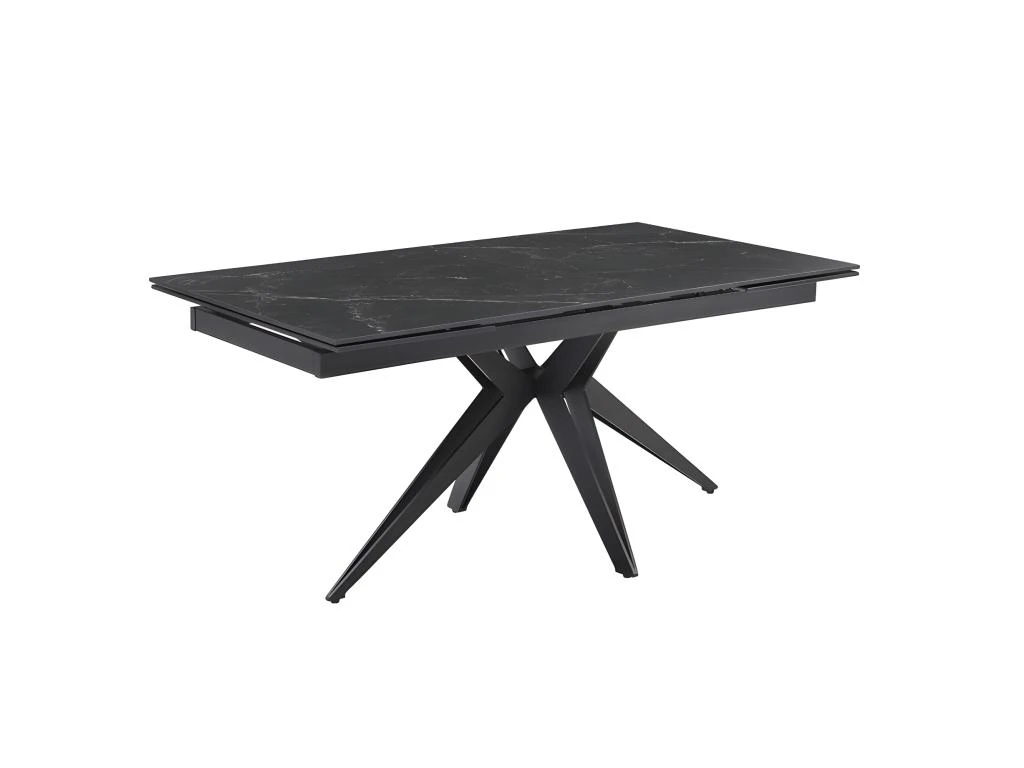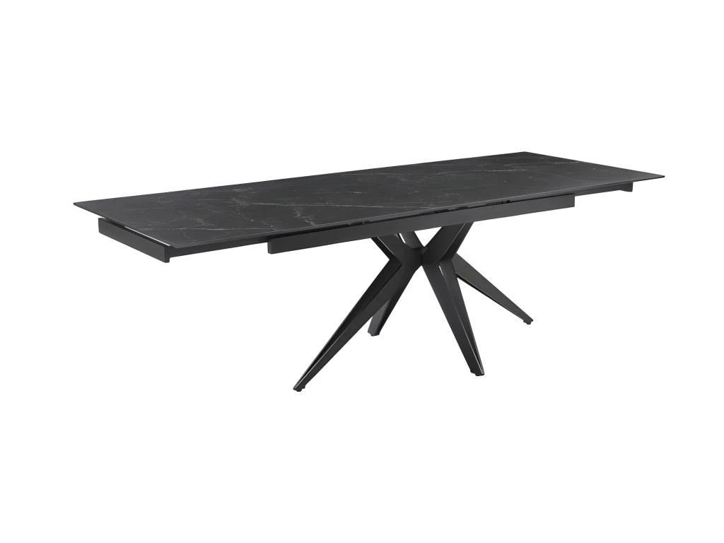 La table personnalisée adaptée à vos envies ! Son plateau en céramique pleine masse de 11mm noir marbré mat est original et robuste. Attablez jusqu’à 10 personnes grâce à ses 2 rallonges intégrées de 40 cm chacune, pratiques, et simple d’utilisation. Elle passe ainsi de 160 à 240 cm. Son plateau en céramique lui confère des qualités remarquables : résistance aux rayures, insensible aux taches diverses, et ne craint pas les différences de températures. Son piètement étoile ajouré en métal noir vous assure stabilité, robustesse et finesse !