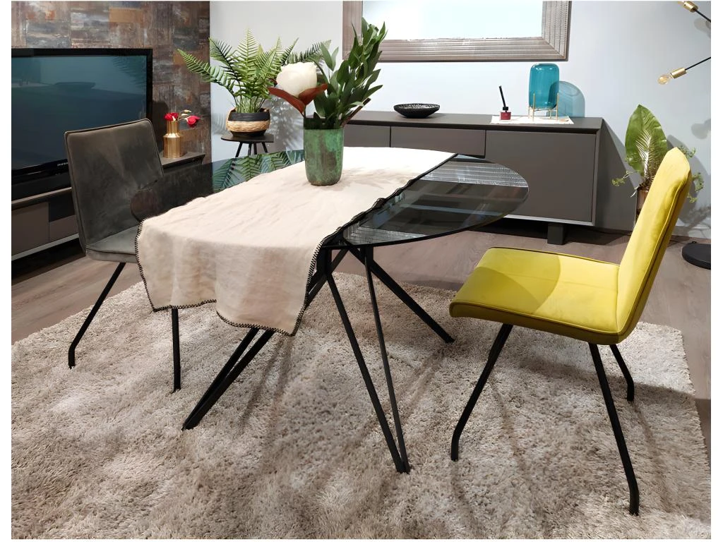La transparence du plateau en verre fumé apporte légèreté à l’ensemble et met en valeur la structure du piétement.
