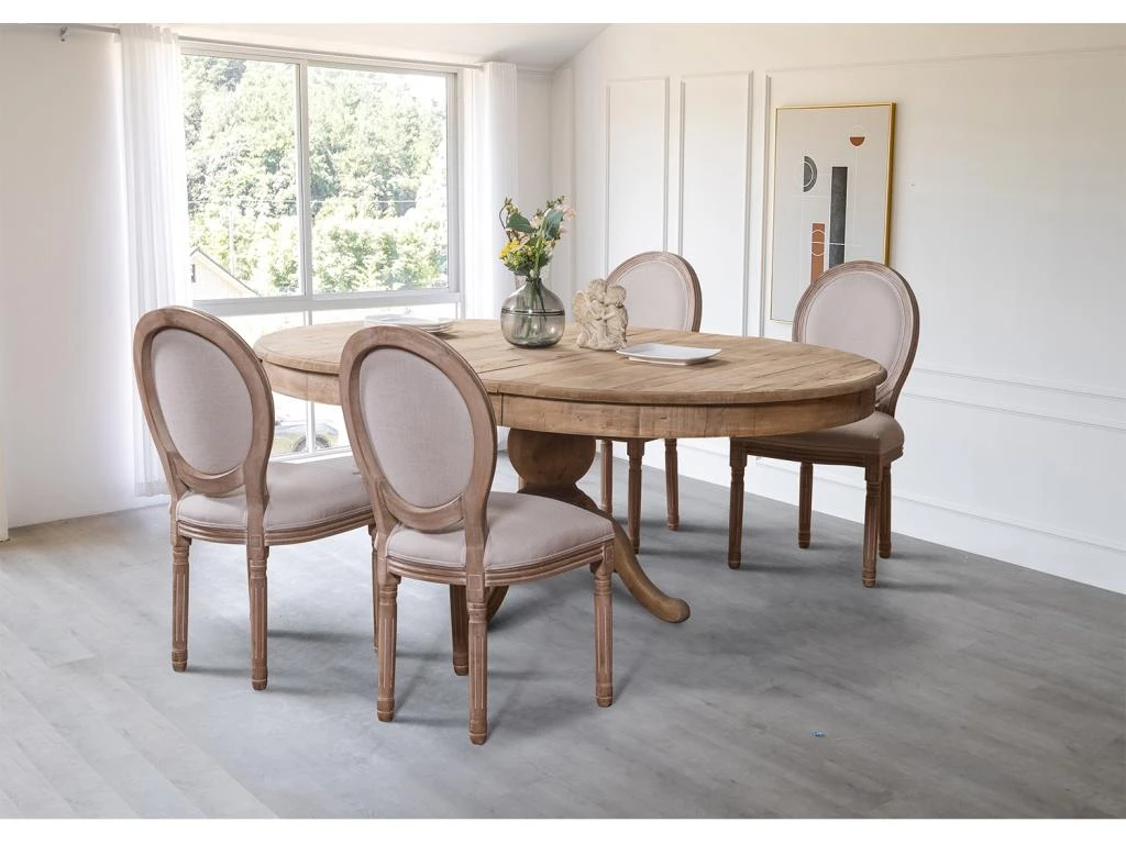 Le plateau en bois brut naturel ainsi que son pied central aspect vieilli aux courbes arrondies vont parfaitement s’accorder avec une décoration classique. Sa possibilité d’extension grâce à sa rallonge vous permettra de recevoir jusqu’à 6/8 convives afin de passer un moment convivial.