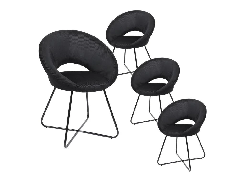 Ensemble repas composé de la Table Allongeable 120-160cm avec plateau effet bois et piétement scandinave métallique noir, et de 4 Fauteuils ajourés en Velours Côtelé Noir Konae.
