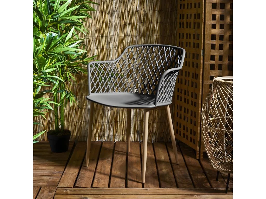 Piétement en fer, finition aspect bois verni. Assise et dossier en polypropylène.